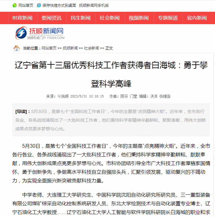 编者按:近日,抚顺新闻网对辽宁省第十三届优秀科技工作者获得者我校白海城老师勇于攀登科学高峰的典型事迹进行了宣传报道。现将相关报道转载如下: