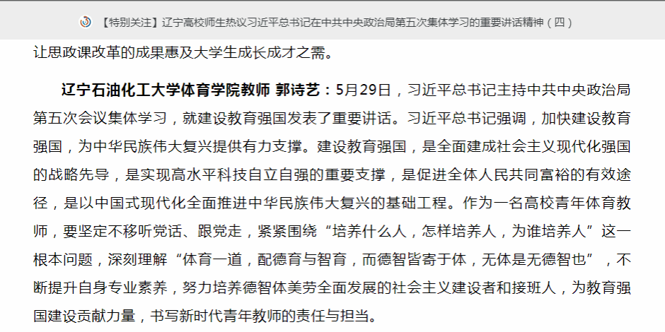 编者按:6月3日,辽宁高校思政微信公众号以《辽宁高校师生热议习近平总书记在中共中央政治局第五次集体学习的重要讲话精神(四)》为题,组稿刊登了我校体育学院教师郭诗艺的感悟。现将相关报道转载如下: