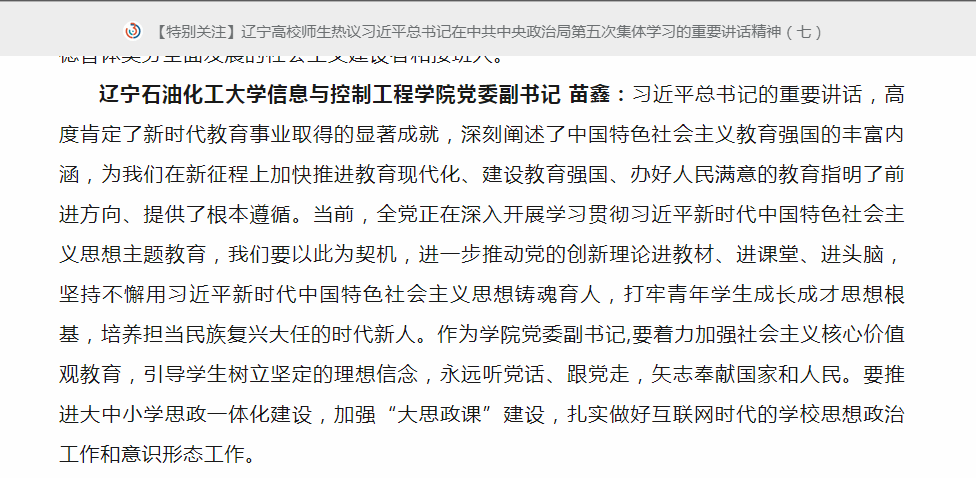 编者按:6月6日,辽宁高校思政微信公众号以《辽宁高校师生热议习近平总书记在中共中央政治局第五次集体学习的重要讲话精神(七)》为题,组稿刊登了我校信息与控制工程学院党委副书记苗鑫的感悟。现将相关报道转载如下: