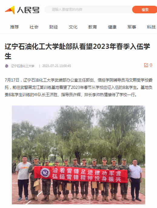 编者按:近日,辽宁日报·北国号、人民日报客户端·人民号等媒体平台对我校武装部办公室主任郭剑、信控学院辅导员冯文熙受学校委托,前往武警黑龙江某训练基地看望了2023年春节从学校应征入伍的8名学生进行了宣传报道。现将相关报道转载如下: