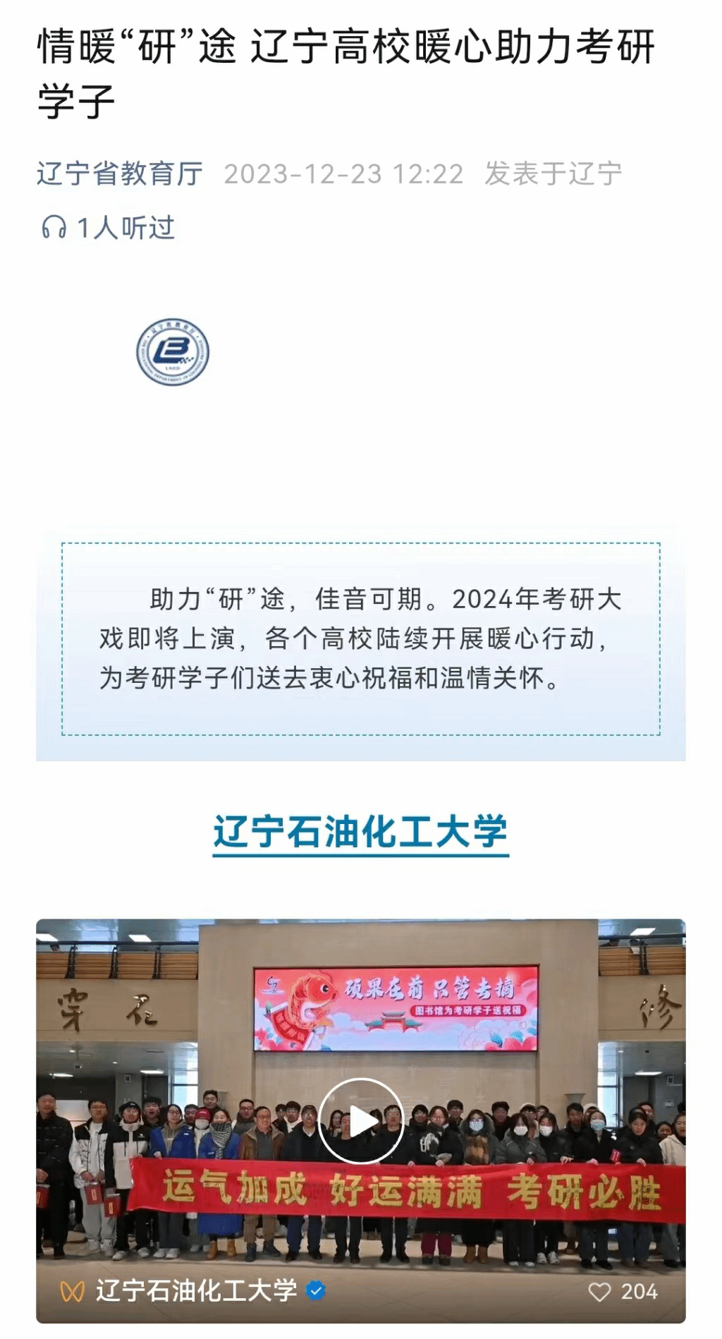 编者按:近日,辽宁省教育厅微信公众号以《情暖“研”途 辽宁高校暖心助力考研学子》为题发文,对辽宁省各个高校陆续开展暖心行动,为考研学子们送去衷心祝福和温情关怀进行了报道,其中对我校图书馆为考研学子发放礼包送祝福的视频进行了组稿宣传。现将相关报道转载如下: