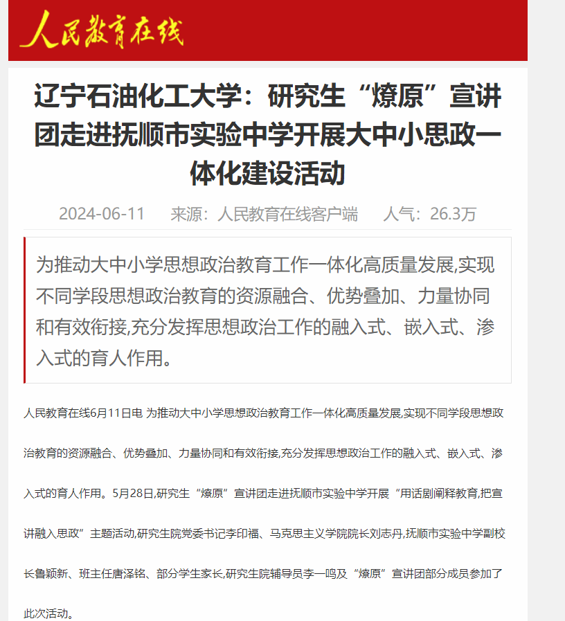 编者按:近日,人民教育在线(客户端)对我校研究生“燎原”宣讲团走进抚顺市实验中学开展大中小思政一体化建设活动进行了宣传报道。现将相关报道转载如下: