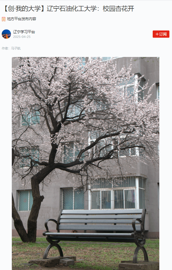 编者按:4月25日,学习强国辽宁学习平台对我校新媒体中心马子航同学拍摄的校园杏花开放的美景以图集的形式做了宣传报道。现将相关报道转载如下: